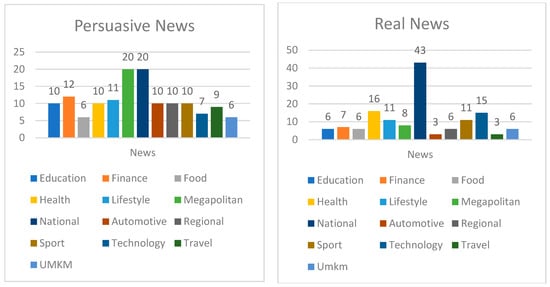 The experiment was conducted on Indonesian news articles collected from six online news portals in Indonesia. Table 1 describes the news portals used in this study. We collected approximately 12,000 news articles from these six news portals. We explore various news categories and choose the most up-to-date news that is applicable to the current situation. Furthermore, the news must contain a greater emphasis on text rather than images. If the images outweigh the text, the process of summarizing the text does not function as intended. We used scraping techniques to collect articles from six online news portals. We built the dataset for six months and were assisted by three annotators. The annotators were selected based on their previous experience working for news companies and their academic focus on news. We conducted detailed interviews and reviewed the work that the annotators had performed. The annotators were involved in labeling the collected articles. The label ‘0’ was given to articles considered persuasive news, and a label of ‘1’ was given to articles considered to be real news. There are several processes that we perform to select datasets. First, we check the number of paragraphs in the news details. Because we use text summarization, where the method summarizes the article, the number of paragraphs in the details has to be at least four. Secondly, we identify slang words in the article, because we only used formal news in this study. Finally, we discussed with the annotator to determine the dataset to be used by looking at the article’s credibility. The credibility of news can be judged based on several factors: clear news sources, news writers, news supported by facts and data, writing style, and additional sources of information. We used 1708 articles from various news categories. Only the body of an article can be used by a text classification algorithm []. Within the dataset, there are 854 persuasive news and 854 real news. The real news categories include education, finance, food, health, lifestyle, megapolitan, national, automotive, regional, sport, technology, travel, and small and medium enterprise (SME). Figure 4 shows the distribution of categories for the persuasive news and real news labels. Furthermore, Table 2 shows the overall statistics of the dataset that used in the text summarization process.