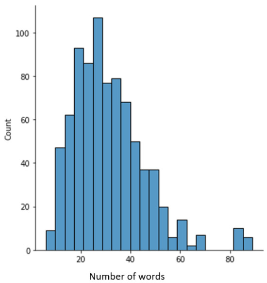 Several factors exist which limit the performance of RE methodologies in the context of biological text. These include, for example, the use of domain-specific terminology, the structural complexity of biological sentences, the limited availability of annotated data, and the model’s lack of domain-specific knowledge and biological context [9,12,13]. Among the factors, complex sentence structure poses a significant challenge in RE because the biological literature frequently features complex sentence structures, including nested clauses and long sentences [14,15]. Figure 2 depicts the distribution of the length of sentences (the number of words in each sentence) for the LLL dataset [16]. The length of the longest sentence in the LLL dataset is 89 words containing six phrases and 10 gene/protein entities, some of which may be repeated. The presence of multiple entities and phrases affects the ability of a model to accurately predict true regulatory interactions. Further, the presence of highly specialised and domain-specific terms that may not be well represented in general language models further amplifies the challenge in extracting biological relationships accurately [9,17,18].