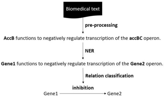 In general, a relation between two entities can be lexical, negation, coreference, or semantic [32]. Biological relation extraction algorithms attempt to accurately identify semantic relationships among various entities [17]. The simplest form of relation extraction (RE) is defined as R:= r(e1, e2, e3…, en) where r is the relation classification among n entities (ei). The nested form of RE, a more complicated form, is defined as R:= r(s1, s2, s3…, sn), where r is the relation type and s can be either a simple form or a nested form of RE. While a binary relation between two biological entities deploys a binary classification to predict their semantic relationship, the multiclass relation estimates a semantic interaction and classifies its type [33]. For example, an interaction between two gene/protein entities can be either inhibitory or activatory. As shown in Figure 3 below, the simplest biological RE is a three-step process including (i) pre-processing; (ii) entity tagging; and (iii) relation extraction [34,35,36]. In the initial stage, pre-processing techniques are employed to refine the extensive biological corpus. This involves selecting and formatting the literature pieces relevant to the domain of study. Next, a Named Entity Recognition (NER) model scans the pre-processed set of biological sentences, diligently identifying named entities of interest. For example, in the sentence “AccB functions to negatively regulate transcription of the accBC operon”, the NER model recognises AccB and accBC as gene/protein entities. These identified entities are replaced and labelled with placeholders like “GENE1” and “GENE2” for the purpose of anonymisation or to generalise the entities during analysis. These replacement labels ensure the focus is on the relationship between entities. After labelling the identified entities, the next step in the relation extraction process is relation classification. Relation classification involves determining the specific type or category of relationship that exists between the labelled entities. This step typically employs machine-learning models or rule-based systems to assign a relationship label to the pair of entities, indicating the nature of their interaction or connection within the context of the text. the relation classification step would determine whether they are related through a specific biological relationship, such as regulates, interacts with, inhibits, or encodes.