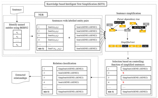 Figure 5. Framework of biological relation extraction using Knowledge-based Intelligent Text Simplification (KITS). KITS comprises three steps: named entity recognition (NER), sentence simplification, and selection using controlling function evaluation. The red ‘x’ represents the rejected simplified sentence.