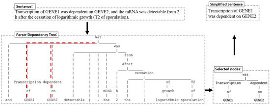 where i is the index position of the word in the original sentence, l e 1 is the last word of selected nodes that are related to e 1 (GENE1), and f e 2 is the first word of selected nodes that are related to e 2 (GENE2) and f e 1 e 2 represents the distance between the two independent phrases comprising the selected nodes for each entity. As illustrated in Figure 8, the simplification of the sentence “A low concentration of GerE activated cotB transcription by final GENE1 RNA polymerase, whereas a higher concentration was needed to activate transcription of cotX or GENE2” results in the simplified form “activated transcription by GENE1 polymerase needed activate transcription of cotX GENE2”. This simplification erroneously suggests a functional or dependent relationship between the activated transcription action of GENE1 and the active transcription of GENE2. In reality, the original sentence indicates no direct relationship between GENE1 and GENE2. The simplification technique, in cases where there is no direct relationship, may miss important nodes and generate sentences that imply a relationship that does not exist.