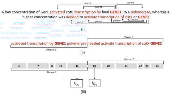 Figure 8. (i) Illustrates the chosen parents/dependent nodes for each entity (GENE1 and GENE2) for text simplification using the proposed method in red (there were no entity-dependent nodes for the sentence). (ii) Provides the simplified version of the sentence, emphasising the two distinct phrases created from the selected nodes related to GENE1 and GENE2, represented as Phrase1 and Phrase2; and (iii) indicates the index position of each selected node in each phrase as per the original sentence, including the indexes representing i l e 1 and i f e 2 in Equation (1).