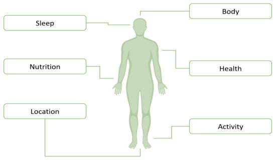 - Characteristic identifiers: data types related to the user characteristics, for example, the user’s activity mode, sex, date of birth, skin type, blood type, or the use of a wheelchair [];
