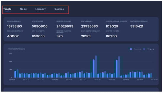 The analytics tab is composed of four sub-tabs, namely Tangle, Node, Memory, and Caches. As depicted in Figure 3, the Tangle subsection supplies several valuable metrics, such as known messages, new messages, received messages, messages sent, message requests received, sent message requests, heartbeats received, heartbeats sent, milestone request received, sent milestone request, and deleted packets.
