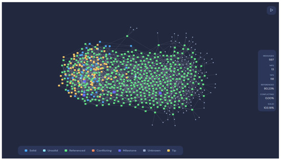 The state and the throughput of the network are viewable in the network graph, as depicted in Figure 4, which represents the construction of a Tangle or a DAG graph, i.e., the distributed registry in which are stored all transitions. In the sidebar of Figure 4, there are the following Tangle properties: (i) messages that indicates the number of messages sent; (ii) MPS, i.e., the number of messages sent to the network per second; (iii) TIPS, i.e., the number of unapproved transactions; (iv) referenced, i.e., the percentage of transactions referenced by other transactions; (v) conflicting, i.e., the percentage of transactions with conflicts; and (vi) solid, i.e., transactions with their history.