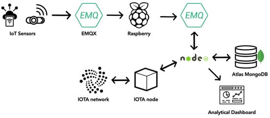 Among DLTs, the blockchain is a technology that can enhance the privacy and security of IoT-interconnected smart devices, as several papers have demonstrated [26,27]. The blockchain offers features such as transparency, immutability, resilience, and cryptography that can address some of the challenges of IoT network architecture. However, the blockchain also has a cost in terms of transaction fees and architectural complexity, requiring expertise from various disciplines. Therefore, the blockchain should manage valuable assets, such as business data and financial assets [28]. On the other hand, the IOTA Tangle is a DLT that can improve sustainability and agrifood monitoring without such costs, allowing agrifood supply chains to adopt it without affecting their business [29].