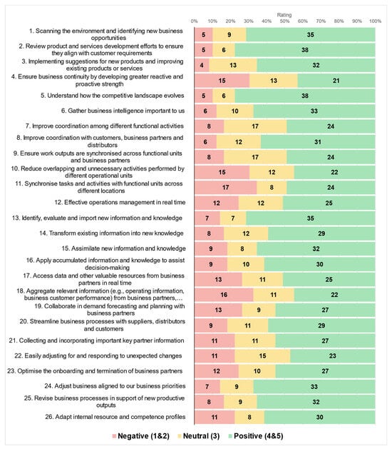 Overall, the respondents view all organisational capabilities as important with Statement 5, “Understand how the competitive landscape evolves” and Statement 2, “Review product and services development efforts to ensure they align with customer requirements”, receiving the most positive ratings, whereby 78% (N = 38/49) agreed with this statement. Statement 11, “Synchronize tasks and activities with functional units across different locations”, is the most negatively rated question, whereby 35% (N = 17/49) disagreed with this statement. The most neutrally rated statements are Statement 7, “Improve coordination among different functional activities”, and Statement 9, “Ensure work outputs are synchronized across functional units and business partners”, with 35% (N = 17/49) of respondents rating both statements neutrally. Further, no respondent opted to answer the open-ended question.