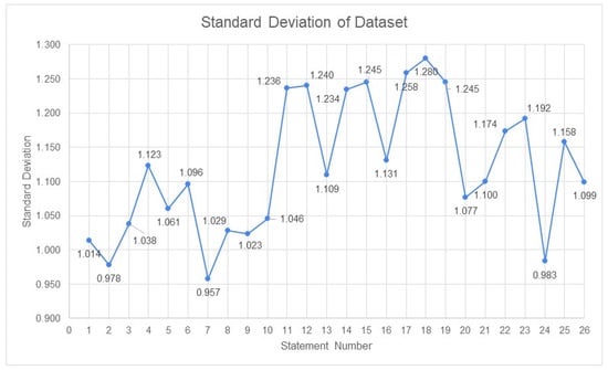 The descriptive statistics include the mean, median, mode and standard deviation for the dataset. Mean is the average of the data points for each statement [58], median is the middle value of the list of responses for each statement [58], and mode is the value that occurs most often [58]. A deviation from the mean is given by the standard deviation shown in Figure 2 for the dataset [58]. A standard deviation greater and equal to 1 indicates a relatively high variation, while a standard deviation less than 1 could be considered low. A low standard deviation indicates that the data points tend to be very close to the mean; a high standard deviation indicates that the data points are spread out over a large range of values [58]. Figure 2 shows the standard deviation for this dataset.
