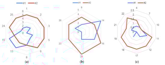 The second step of the two-step process could be executed with the acquisition of two digital capability domain profiles. Each organisation was asked to rate their organisation on the checklist prototype shown in Table 5 using a pre-defined scale. The pre-defined scale applied a measurement scale of 0 to 3, where 0 indicates that the organisation does not focus on a particular statement action at all, and 3 indicates that the organisation is aware of and continuously focuses on the statement action, showing mastery of that particular statement action. A score of 1 indicates that the organisation is aware of a statement action although no planning or monitoring of a statement action has yet been developed. A score of 2 indicates that the organisation is aware of a statement action, has put a plan into motion and is continuously working on it but has not yet reached mastery. The evaluation of Organisations #1 and #2 against the prototype checklist and by applying the pre-defined scale was then visualized with a radar chart for high-, medium- and low-priority statement actions, as shown in Figure 3.