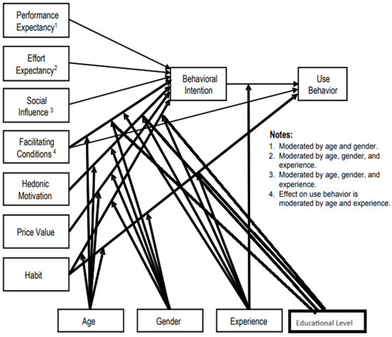 Based on 161 studies published between 2007 and 2016, a meta-analysis found that UTAUT’s four independent variables had low or moderate effects on users’ behavior and intentions to change [45]. In UTAUT2, the explanatory power of behavioral intention grew from 56 to 74%, whereas use behavior rose from 40 to 52%. This is the highest ranking of the available models [45].