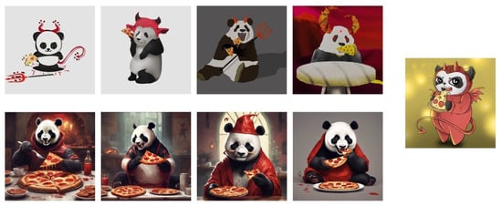The same prompts were used for the generation of illustrations, both for the AI tool and the illustrator and students: an illustration of a panda bear (character) dressed as a devil (context) eating a slice of pizza (action). A total of 9 illustrations were generated.