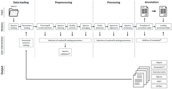 The MSProfileR tool is a Shiny application assessing the conformity of mass spectra profiles for future analysis. It was developed in R programming language version 4.3.2 and in the RStudio environment version 2023.10.31 (R Core Team, 2020: R Foundation for Statistical Computing, Vienna, Austria. https://www.r-project.org/ (accessed on 11 February 2024)). The general workflow of the application was divided into five major steps: (1) the data loading tool that includes spectra import, (2) the preprocessing tool including successive steps to control the conformity and quality of spectra, (3) the processing tool including peak detection and MS spectra classification, (4) the spectra annotation tool allowing to add complementary metadata to each spectrum and finally (5) the output tool generating several files including a report (Figure 1). Each step of the MSProfileR was composed of several modules, each performing one or more tasks. During the pipeline process, the user controls and adjusts the parameters of the MS spectra analysis. However, it is possible to realize the entire workflow without any intervention by using default parameters or loading parameters defined in a previous analysis. To make MSProfileR easier to use, a graphical user interface (GUI) was created using the Shiny R package version 1.7.2. A wrapping of existing R packages, available in Comprehensive R Archive Network (CRAN) repositories, was conducted. Shiny R package allows for the building of an interactive web application straight from R. The different steps and modules from MSProfileR are described below.