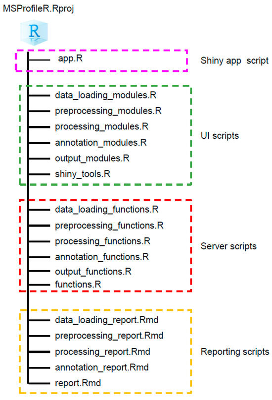 Tree overview of the application architecture. The MSProfileR tool was created under R language with a Shiny interface. The scripts was divided into three parts, the user interface (UI), the server and reporting scripts.