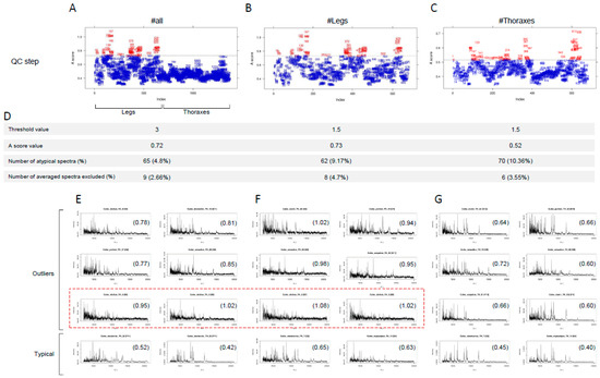 | Detection of outliers outside the upper and lower thresholds | Ascore | Spectra below the lower threshold included | Plotting of spectra with respective Ascore, threshold indicated by dotted line(s) and outliers colored in red numbers. | |||