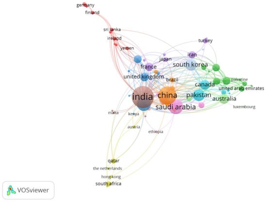 The prominence of countries in the network visualization depicted in Figure 2 reflects the frequency of healthcare sectors in those nations publishing articles on the Internet of medical things’ applications and challenges. This highlights India as the most invested country in researching this subject matter. Moreover, the interconnections between these circles illustrate the extent of co-citation relationships among the journals, indicating the influence of articles across different nations’ publications.