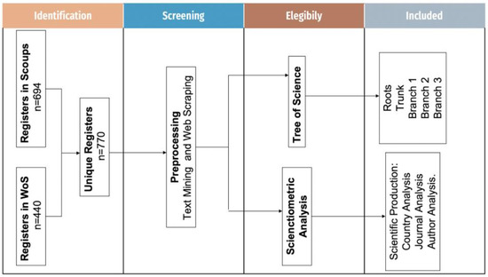 For this, search equations were applied in the WoS (Web of Science) and Scopus databases where all the records and extracted references were analyzed. This review of references from these two databases was unified in a single data set, which was processed using the Tree of Science (ToS) methodology and was analyzed using the package programmed in R Tosr (https://cran.r-project.org/web/packages/tosr/index.html, consulted on 20 December 2023). After this process, a scientometric analysis was carried out that helped to understand the trends of these contributions at a national level. This article is organized as follows: first, the methodology section provides details about the articles and the data analysis resulting from the search process. Then, in the results section, the detail of the second scientometric analysis of the documentary analysis is presented, which is provided through the Tree of Science methodology: roots, trunks, and branches, thus showing the most relevant aspects and exposing the conclusions of the research performed.