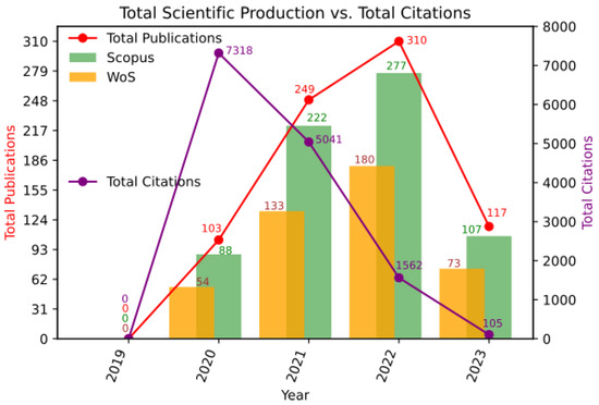 The scientometric analysis, also called scientometrics, focuses on carrying out a quantitative analysis of the scientific data, among which the behavior of the annual production in a line of research, the collaborations between different authors, and their academic networks to work together [12]. There are different ways of being able to represent the results of scientometric analysis, among which the following stand out: Analysis by citation [13], Collaboration Networks [14], and Intellectual Structure [15]. The methodology used to describe the results of this review is based on an analysis from the general to the, which will start from the analysis of production and trends by ranges of years, to later identify the countries and journals that are publishing the most in the world—topic and finally to know how the collaboration process between the different authors has been. The analysis is based on a condensed view of the results issued by the WoS and Scopus databases and in this review, there will be a descriptive analysis of the findings found.