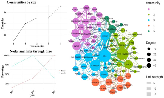 In this same sequence, it is also important to identify how collaboration and citation indices among countries have behaved (see Figure 3). Where five communities can be identified, led by the United Kingdom, USA, Saudi Arabia, and Nigeria. The first community (light green) shows a relationship of journal citations from different countries but predominantly from the European continent, led by the United Kingdom. These publications focus on analyzing the different risk factors of the coronavirus and how to make contributions to identify these factors early to avoid mortality risks. Among the most accepted articles in this community is the author Torous [28] about how COVID-based processes have supported the identification of procedures for implementing teleassistance in older adults. The second community (blue), is led by the United States, with a relationship with countries of high technological development such as China, Canada, Japan, and Russia among others, the themes that relate to this community are largely focused on the development of technology for tracking symptoms associated with COVID-19, where the work of Aziz [24] stands out, showing how teleassistance can help in the monitoring of patients with high-risk pregnancies.
