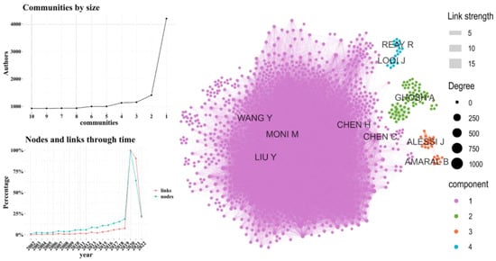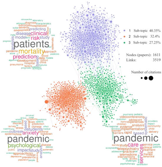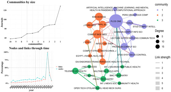 The third community, in orange, shows the contributions of Brazilian authors who explore an innovative application of machine learning technology for the detection of positive and recovered COVID-19 patients through voice analysis. This study represents a significant advance in the field of telemedicine and remote diagnosis, offering a non-invasive and accessible methodology for disease monitoring. One of the main contributions of the work is the development of a machine learning model that can differentiate between the voices of individuals infected by SARS-CoV-2 and those of non-infected individuals, as well as identify those who have recovered from the disease. To achieve this, the authors analyzed a wide range of voice characteristics collected from participants both positive and recovered from COVID-19, along with a control group of non-infected individuals [54]. The fourth community focuses on the interaction of Australian authors examining how the COVID-19 pandemic has influenced the provision of outpatient psychiatric services in private practice in Australia. This analysis, based on the study by Looi, J. C., et al., specifically centers on the use of new telepsychiatry services enabled by the Medicare Benefits Schedule (MBS) compared to face-to-face psychiatric services during the third quarter of 2020. The study provides a detailed analysis of the change in the provision of psychiatric services in response to the pandemic, highlighting a significant increase in the adoption of telepsychiatry. This adoption was facilitated by the introduction of new telemedicine items in the MBS, a measure designed to support the continuity of psychiatric care while minimizing virus transmission risks. The authors analyze trends in the use of outpatient psychiatric services, comparing telepsychiatry sessions with face-to-face consultations, and evaluate the impact of these modalities on psychiatric care during a period of unprecedented public health restrictions [55].