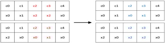 where and are two intersection points, and , creates a random number between one and the entire length of the chromosome. Subsequently, the two chromosomes between these cuts have their values changed, resulting in two new chromosomes. The crossover details are illustrated in Figure 1 [].