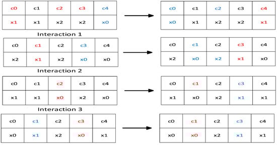 Mutation operations introduce new features on chromosomes, namely exchange mutations, uniform mutations, and percussion mutations. In this strategy, the arrangement is arbitrarily chosen, and its quality value is replaced by the value of another quality arrangement []. To confirm and demonstrate that each arrangement has an equal chance to induce new features, the starting and ending positions are first selected, and then the genes at those positions are swapped. In the next iteration, the position from the beginning is added and subtracted from the last position and then the gene value is exchanged at this position, and so on. An illustration can be seen in Figure 2 below [].