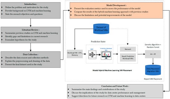 Figure 3 is a flowchart that outlines the research process for the study on live virtual machine (LVM) migration using a hybrid machine learning approach. The process is divided into five main stages: introduction, literature review, data collection, model development, and conclusion and future work. The introduction stage defines the problem and motivation for the study, provides background on LVM and machine learning, and states the research objectives and questions. The literature review stage summarizes previous LVM and machine learning studies, identifies gaps and limitations in current research, and formulates hypotheses for the study. The data collection stage describes the data sources and collection methods, explains data preprocessing and cleaning, and presents the final dataset used in the study. The model development stage introduces the evaluation metrics used to assess the model’s performance, compares the results of the hybrid machine learning approach of the previous studies, and discusses the model’s limitations and potential improvements. Finally, the conclusion and future work stage summarizes the study’s main findings and contributions, discusses the study’s implications for data center performance and management, and suggests directions for future research on LVM and machine learning in data centers. Overall, Figure 3 provides a clear and concise visual representation of the research process for the study, highlighting the key stages and their corresponding activities.