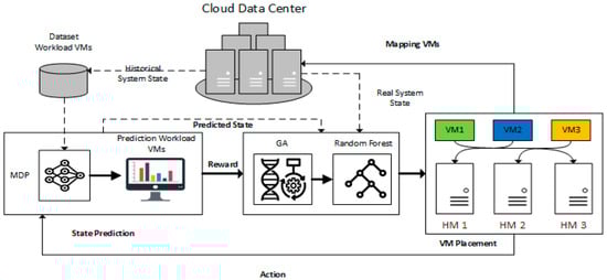 In this research, the authors attempted to enhance the machine learning model by utilizing the Markov Decision Process (MDP). This is often one of the types of algorithms frequently used in machine learning (ML) to generate optimal policies. Another application of MDP can be seen in the study conducted by Guo et al. in 2020 []. The study concludes that the Markov Decision Process (MDP) can streamline path problems in the Hybrid Flow Shop Scheduling Problem (HFSSP) domain, reducing their complexity and showcasing significant potential in the field. It also conserves computational resources for efficient optimization. Based on various research findings, MDP emerges as a viable option for delivering optimal solutions in intricate decision-making scenarios. To further enhance the MDP approach, additional algorithms are required to augment the decision-making process, particularly in the live virtual migration (LVM) process. This was highlighted in the research conducted by Ajmal et al. in 2021 []. It is suggested that to reduce the workload on a virtual machine (VM), the implementation of a genetic algorithm (GA) is recommended. GA is shown to reduce the unbalanced workload in the VM by assigning tasks to groups, detecting the workload of the overloaded VM, and scheduling to manage the VM. Therefore, based on the research organized by Haris et al. in 2023, this study will aim to improve LVM consolidation through a hybrid machine learning approach based on MDP, GA, and random forest (RF). This is not only intended to increase accuracy but also to optimize decision making in the LVM process, as well as to address issues in VM migration scheduling. In addition to improving the accuracy of the learning machine in live migration technology decision-making processes, our research goal is to develop rules for LVM that focus on enhancing the accuracy of the machine learning model and balancing DC workloads. To achieve this, we consider the balance of the VM workload as a key factor. The balance of the VM workloads is determined by CPU and memory, as well as by prioritizing LVM scheduling for migration.