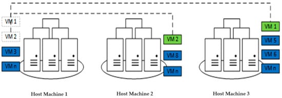 Virtual machine (VM) technology is one example of server virtualization. Some issues encountered on virtual machines include overloading, the full availability of the host machine (HM), overloading, and the availability of the HM []. These problems are common in data centers (DCs), as performance must be consistently optimal to support business activities and other applications. Therefore, addressing these complex issues requires an appropriate approach. An indispensable strategy in this context is live virtual migration (LVM), one of the goals of which is to balance the workload on virtual machines and address other related issues [].