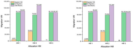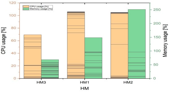 Figure 5 illustrates a test scenario for VM placement and migration using the GWA-T-12 Bitbrains dataset [,]. In this scenario, a migration process is conducted for the HMs experiencing overload utilizing datasets from Bitbrains clouds. The availability of resources at the destination HM, such as CPU, memory, and disk space, is considered when determining the VM placement. Moreover, equipment compatibility between the source and destination is assessed to ensure proper VM operation post-migration. Figure 6 displays the results of processing the dataset for this test scenario. Due to the lengthy loading process on GA, only the dataset resources of 156 MB are utilized. The live migration network is not executed due to the necessity for network simulation via a router and the internet.