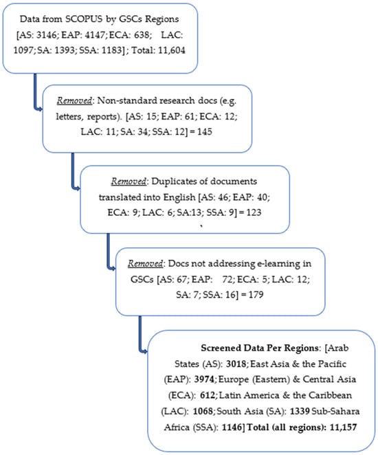 The SCOPUS database survey produced 11,604 documents for the six regions (Table 2) before filtering and screening. The retrieved items went through further screening before inclusion in this study (Figure 1). A few published documents in VE occurred before the millennium in GSCs as follows: AS: (15); EAP: (5); ECA: (1); LAC: (3); SA; 1; SSA: (1). Some publications used the term ‘distance learning’ in the context of traditional brick-and-mortar open learning centers or postal mailing-based correspondence education, which are outside the scope of e-learning and this study. Publications addressing these ‘out of scope topics’ were excluded. Four-hundred-and-forty-seven (447) documents were discarded in the screening process, thus reducing the total to 11,157 from the six GSC regions. Figure 1 shows the data screening processes.