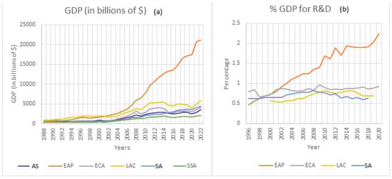 (a) Growth in GDP among GSCs, 1998–2021 []; (b) growth in R&D expenditures as % of the GDP among GSCs/Regions, 1996–2020 []. Data unavailable for AS and SSA regions.