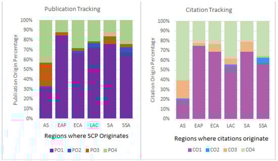 This section tracks and examines where the e-learning research and publication in the GSCs’ regions has originated from based on authors’ institutions and country affiliation. The results were generated from the R-Bibliometrix application discussed in the earlier section. The results help to highlight a country’s self-reliance or dependence level on other GSCs or the global north for e-learning R&D. This addresses the third research question (RO3). For each region, we grouped the SLP into four (4) categories (POi; i = 1…4) and the associated earned citations (COi: i = 1…4), where 1 = dominant GSCs (top 10 most productive countries), 2 = non-dominant GSCs in each region, 3 = other GSCs regions, 4 = global north countries or non-GSCs (this applies to research activities and publications on e-learning activities in the GSCs carried out by academics and researchers domiciled in the global north (e.g., [,]). Figure 5 presents the results of the publications and citations tracking for the six GSCs regions.
