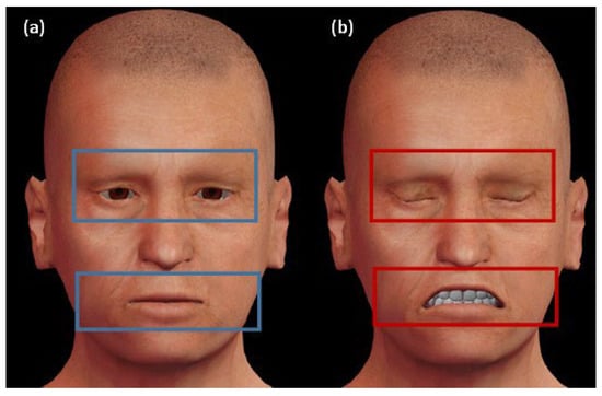 Facial expression areas that reveal if the patient is under deterioration or not. (a) The left avatar expresses a neutral expression, which is bounded by the blue rectangles. (b) The right avatar reveals deterioration status in the final stage, which is bounded by the red rectangles.