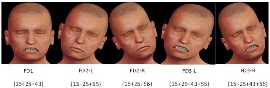 The results showed that the avatar’s deteriorated expression was perceived to be more intense and more believable in the presence of a combination of the upper part and lower part of the face. Figure 2 shows an avatar with five different expressions in perceptive of deterioration, and each particular expression belongs to one class, such as the combination of AUs (15 + 25 + 43) belonging to the class named FD1, AUs (15 + 25 + 55) belonging to the class named FD2-L, AUs (15 + 25 + 55) belonging to the class FD2-R, AUs (15 + 25 + 43 + 55) belonging to the class labelled FD3-L, and finally, the FD3-R class includes samples that show the combination of AUs (15 + 25 + 43 + 65).
