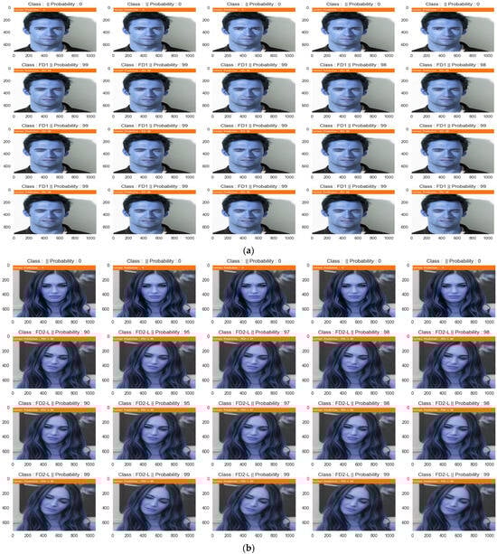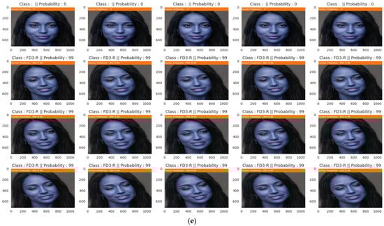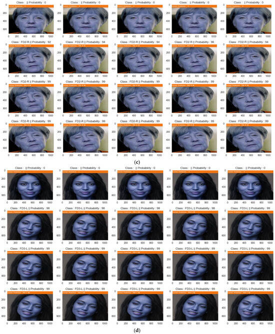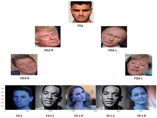 In summary, after generating and recording the facial expressions of each avatar, the facial expressions of avatars were transferred to static images of real people’s faces using the Celebrity Face Image Dataset that is available as an open database on Kaggle. Using the FOMM, the number of generated videos was expanded to reach 176 video clips that had colourful sequences of frames with a framerate of around 25 fps and a length of each video (11–12) seconds, so we had (275–300) frames in each video. The paper presents 176 generated videos, and there were around 50,550 frames for all videos. The five facial expressions are shown in Figure 4.