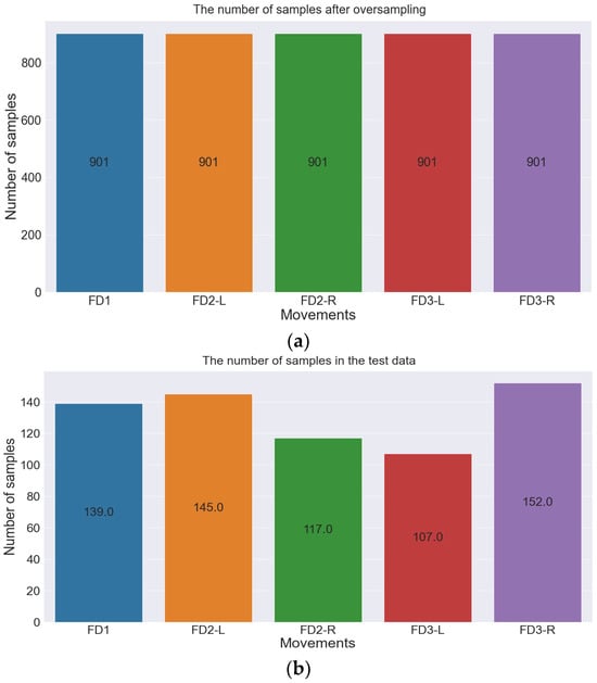Number of training samples before and after oversampling method. (a) Number of samples of training dataset before oversampling. (b) Number of samples of training dataset after oversampling.