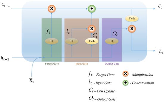 LSTM can handle temporal input data and achieve high accuracy of prediction; however, it suffers from capturing spatial data, resulting in failing to capture features of spatial data. Therefore, Xingjian and other contributors [] addressed this problem and developed ConvLSTM, which replaces the state-to-state transition operations in the LSTM with convolution operations. It involves convolution operation within the LSTM structure, and it is particularly popular in computer vision and video analysis tasks as it has demonstrated remarkable success in capturing and handling complex dynamic patterns within image sequences and video streams. The ConvLSTM model expands the traditional LSTM capabilities by involving convolution layers to propose a method that allows the model to learn and retain spatial dependencies in the input sequential data producing an effective prediction model for tasks involving sequential data with spatial characteristics such as video analysis, spatiotemporal modelling, and image sequence processing [].
