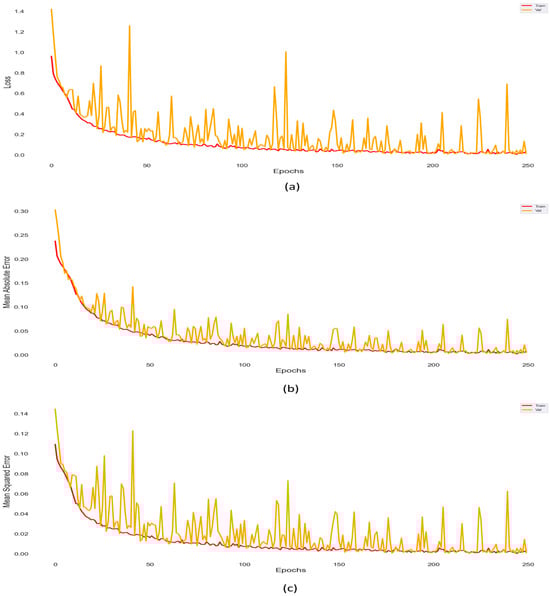Loss, Mean Square Error and Mean Absolute Error. (a) Loss of the predicted model. (b) Mean Square Error of the predicted model. (c) Mean Absolute Error.