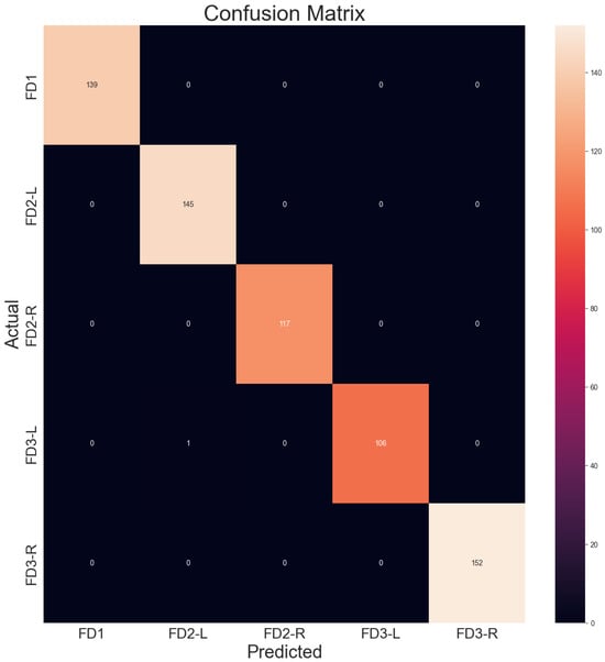 The percentage of accuracy of model prediction for unseen data for different classes. (a) Accuracy of prediction of unseen data predicted as Class FD1. (b) Accuracy of prediction unseen data predicted as Class FD2-L. (c) Accuracy of prediction of unseen data predicted as Class FD2-R. (d) Accuracy of prediction of unseen data predicted as Class FD3-L. (e) Accuracy of prediction of unseen data predicted as Class FD3-R.