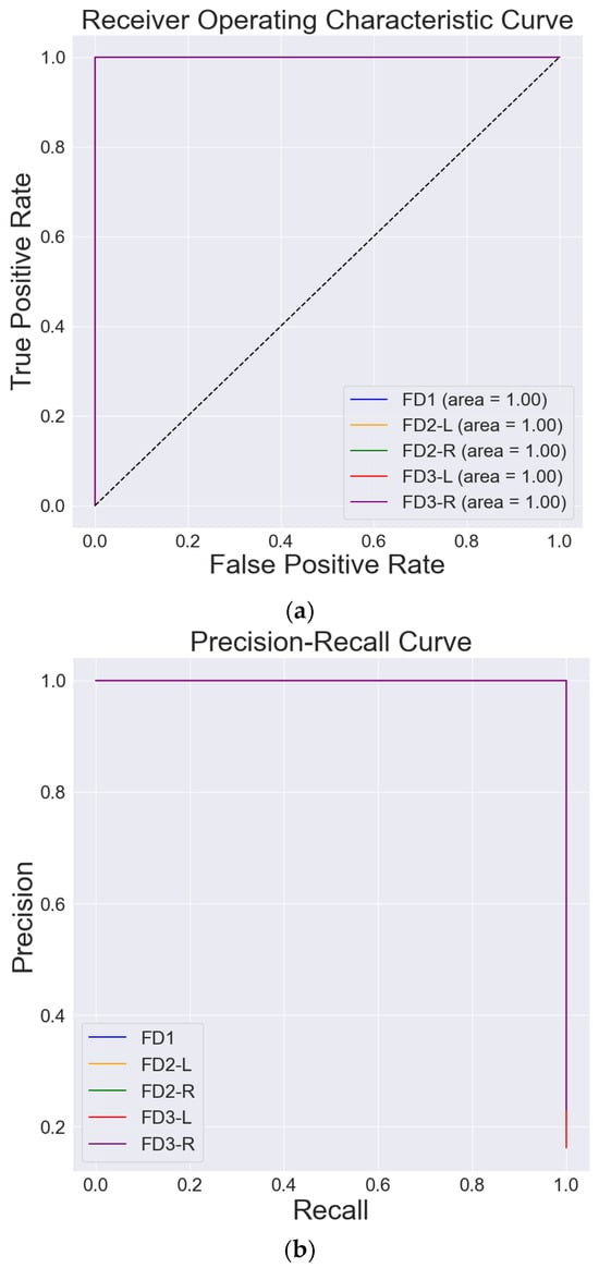 Figure 16a shows the ROC curve and Figure 16b shows the precision-recall (PR) curve, which are used to evaluate the performance of a classifier, especially when dealing with imbalanced datasets.