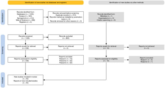 During the screening phase, we first removed 213 duplicate records, leaving 1030 unique records for initial screening. This step is crucial for maintaining the integrity of the review process and avoiding redundant evaluations. Of these, 800 records were excluded based on title and abstract screening, leaving 230 full-text articles to be assessed for eligibility. This substantial reduction demonstrates the rigorous application of our inclusion and exclusion criteria, ensuring that only the most relevant studies progressed to full-text review.