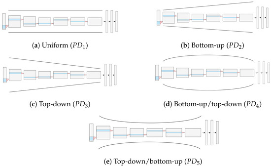 - Pruning distribution. Five types of pruning distributions were selected as follows: uniform (), bottom-up (), top-down (), bottom-up/top-down (), and top-down/bottom-up ()