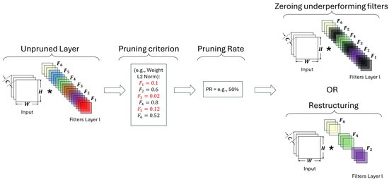 - Weight: this pruning method is based on the estimation of the importance of the layer’s filters according to their weights. In this method, the L2-norm is calculated in each filter, and the ones with the highest values are kept [30]. This is because in CNNs, the filters at each layer with higher activation maps are assumed to be more important for the performance of the network. In this case, there is no required to use random seeds because Weight is a deterministic method, i.e., it is expected to obtain the same result under the same conditions.