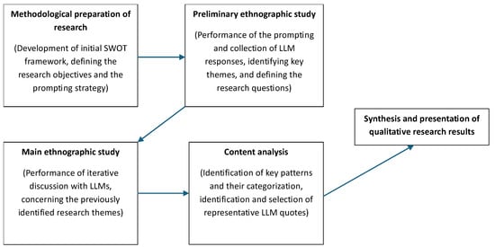 In the first step of our analysis, informed by the previously presented SWOT analysis, we let the LLMs define the initial research questions. Since meaningful conversations with LLMs are facilitated by carefully constructing prompts, setting the context and researchers’ expectations, and guiding the LLM focus, we constructed the prompts for this step using the LLM developers’ recommendations [,]. We consulted the LLMs and iteratively refined a set of prompts focused on the critical evaluation of the baseline SWOT analysis and ethnographic perspective of LLMs and summarized the findings (see Supplementary Material File S1).