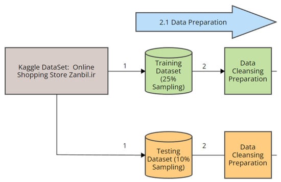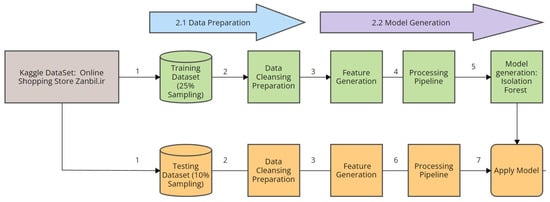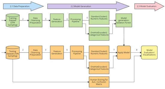 The researchers devised a systematic process as a pipeline that covers the various stages of data ingestion, data type conversion, and data cleansing as part of the data preparation and cleansing stage. After ingesting the dataset, Figure 2 shows that the researchers extracted two sets of data (1): one set for training the model, and another to be used as a testing dataset []. For data preparation, the researchers sampled 25% of the weblogs to act as the training dataset. As part of the data cleaning, the researchers then deleted by dropping any rows with missing data (2). For the training set, the researchers set the parameter max_sampling = 25%, which enabled the project to work on a 25% subset of the full dataset. The researchers anticipated that swamping and masking could possibly occur in this instance [,,]. Swamping is the phenomenon where normal data points are incorrectly labeled as anomalies or false positives, while masking occurs when actual anomalies are incorrectly labeled as normal data points or false negatives [,]. With this, a small sample size yields better iTrees because the swamping and masking effects are decreased [,,]. The cleaning process initially started with the researchers manually evaluating and deleting the rows with missing data, then followed the web traffic dataset cleaning protocols. The data cleaning procedure for the dataset was implemented using Python code augmented in Scikit in order to improve the quality of the data for machine learning by handling different data types appropriately. The researchers noted that the weblog data was in Apache log format and not CSV. Thus, the process of converting the log format to the CSV table format was anticipated to leave some artifacts that researchers need to correct. This cleansing and preparation action was resolved in order to prevent Isolation Forest from throwing an exception when it encounters missing data or incorrect data type.
