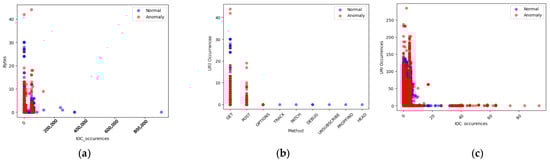 (a) Anomalies in IOC occurrences in bytes. (b) Anomalies in URI occurrences in method. (c) Anomalies in IOC occurrences in User-Agent.