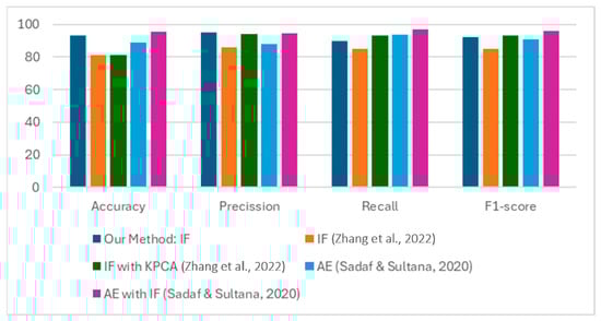 Evaluating the performance of Isolation Forest model implementation for web traffic anomaly detection can also be assessed based on how well it performs on applications for almost similar use cases. As shown in Figure 8, in comparison to other papers using Isolation Forest, the implemented methodology of this study shows comparable performance and faster processing time [,]. A comparable study that also normalized the datasets containing numerical and nominal values then implemented Isolation Forest exhibited an Accuracy of 95.4%, Precision of 94.81%, Recall of 97.25%, and F1-score of 96.01% []. A similar study solely implemented Isolation Forest and compared Isolation Forest with kernel principal component analysis (KPCA) []. The study that processed the dataset comprising 307,510 rows and 122 columns exhibited an Accuracy of 87.3%, Precision of 93.7%, Recall of 92.5%, and F1-score of 93.1% for Isolation Forest with KPCA implementation. For sole Isolation Forest model implementation, it recorded an Accuracy of 80.9%, Precision of 86.0%, Recall of 85.5%, and F1-score of 85.2%. This comparison of performance shows that the study has optimally implemented the Isolation Forest model for web traffic anomaly detection. Also, since Isolation Forest works well with highly imbalanced data, it offers a promising alternative to traditional machine learning techniques and ensemble methods [].