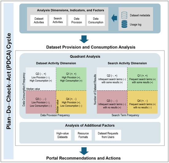 This paper proposes a gap analysis framework to support the Plan–Do–Check–Act (PDCA) cycle to guide OGD portal improvement. The framework adopted the Importance–Performance Analysis (IPA) [14] to identify gaps in an OGD portal. IPA is typically used in businesses for assessing user satisfaction with various attributes and guiding managerial actions to enhance service quality. IPA employs quadrant analysis in identifying interactions between the importance and performance dimensions. In the context of OGD, the quadrant analysis measures the performance and importance of an OGD portal based on data provision and consumption activities. While most portals typically monitor consumption activities via usage log analysis, few consider the relationship and interaction between provision and consumption activities. Our proposed framework uniquely focuses on monitoring and assessing the interactions between the supply and demand sides on OGD portals. The analysis results can support OGD portal managers to identify gaps and take recommended actions for improvement. The framework is also based on the data provision–consumption model provided by Ham et al. [15] with several additional factors affecting open data consumption, such as user search activities, high-value datasets, and resource formats incorporated.