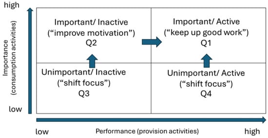 Our gap analysis framework adopted the Importance–Performance Analysis (IPA) [14] to identify gaps in an OGD portal. IPA is typically used in businesses for assessing user satisfaction with various attributes and guiding managerial actions to enhance service quality [48,49,50]. IPA employs quadrant analysis in identifying interactions between the importance and performance dimensions. In the context of OGD, the quadrant analysis represents the performance and importance of an OGD portal based on data provision and consumption activities. The analysis results can identify existing gaps within an OGD portal and guide strategies to reduce or eliminate these gaps in achieving objectives. The quadrant analysis framework for gap identifications within an OGD portal is shown in Figure 2.