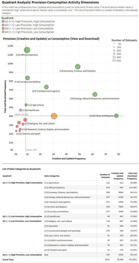 The first analytical task aims to identify the patterns of provision and consumption activities on the portal across dataset categories using quadrant analysis. Figure 3 illustrates the results.
